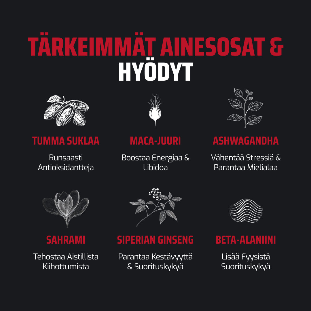 Afrodisiakki suklaa on suunniteltu sytyttämään halu, kohottamaan aistejasi ja lisäämään kipinää intiimeihin hetkiin. Lust tummassa suklaassa on Maca-juurta, Ashwagandhaa, beeta-alaniinia, Siperian ginsengiä ja ripaus sahramia.