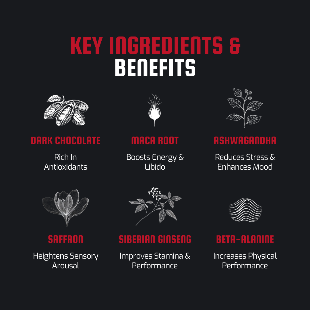 Infused with dark chocolate, Maca Root, Ashwagandha, Beta Alanine, Siberian Ginseng, and a dash of Saffron, this aphrodisiac treat is designed to boost desire, elevate your senses, and add a spark to your intimate moments.