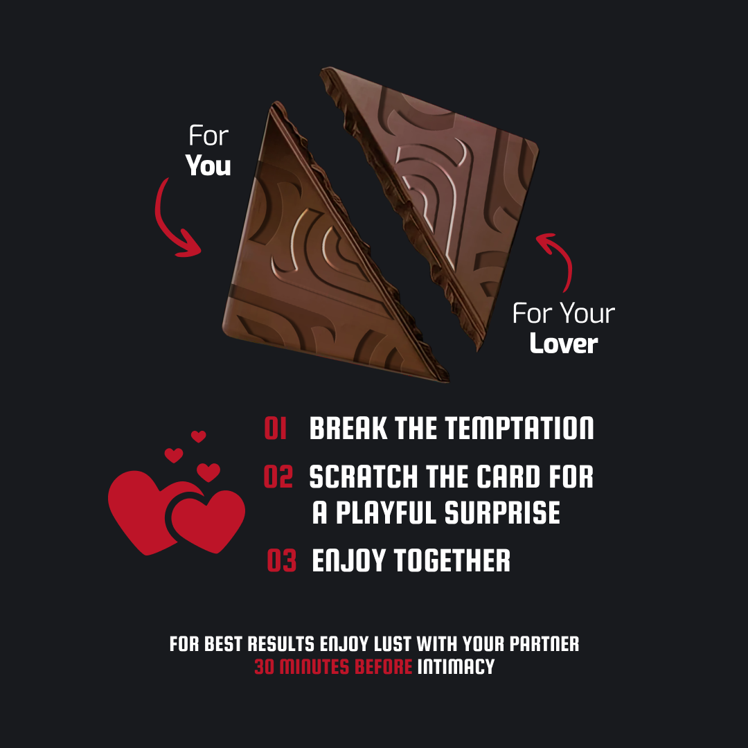 Break the chocolate with your partner and let the anticipation build. Scratch the card for a playful surprise to set the mood just right. Then, enjoy the moment together for an unforgettable intimate experience. For best results, take Lust 30 minutes before to ignite passion and deepen your connection.